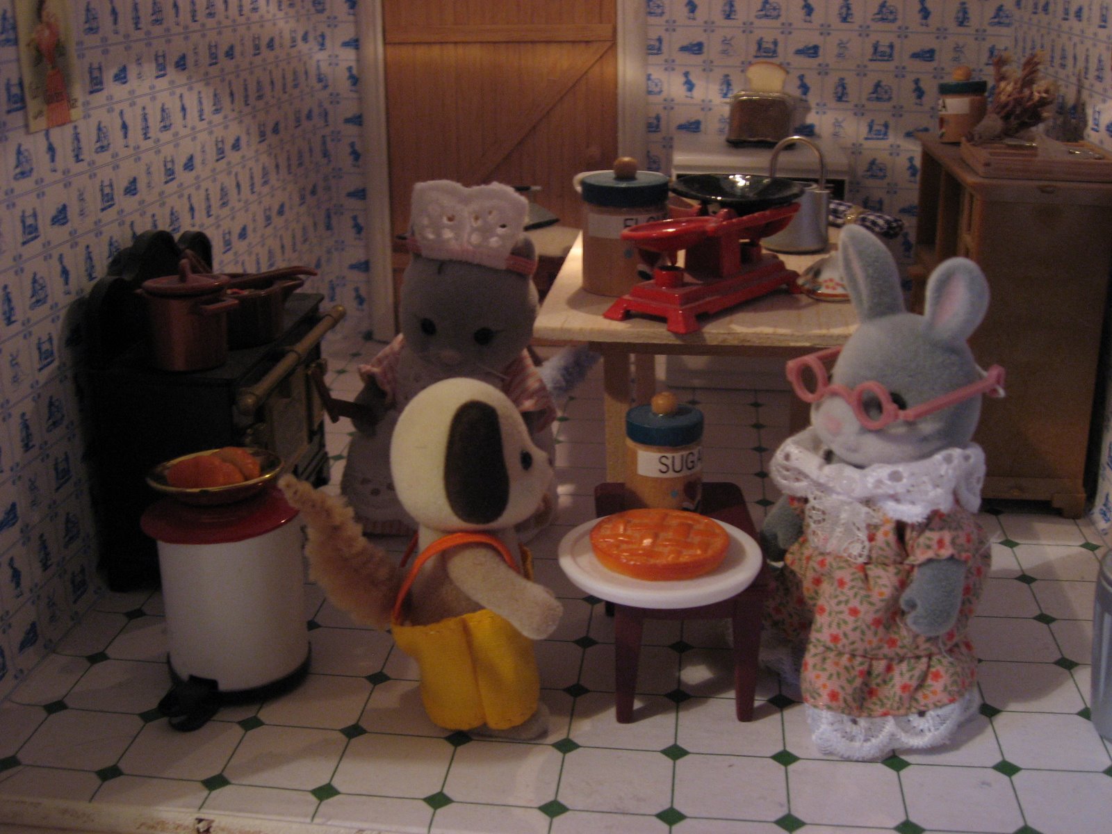 Another day, another job to try. Today I had the chance to help out at the Sylvanian bakery, making cakes and bread for all the animals. It all started quite well with Miss Suzette and Grandma Rabbit helping me to make the pastry and dough. I did get a bit messy with all the flour and sugar and stuff, but that was mainly because the table is so high, and I was a bit wobbly standing on a chair. Eventually they gave me a little low table to work at, and everything went much better. Until, that is, it came to the time to take everything out of the oven. There wasn't much space to put everything down, and I thought that the safest place to put a plate of pies and croissants was on top of a small metal round thing.